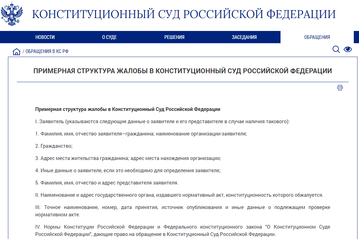 Однако Вы можете найти на сайте Суда законы и нормативные акты, которые помогут составить и подать жалобу, а также в разделе "Обращения в КС РФ" Вы можете получить общую информацию о требованиях, предъявляемых к жалобе в Конституционный Суд, о компетенции Суда, о документах, необходимых для обращения в Конституционный Суд.