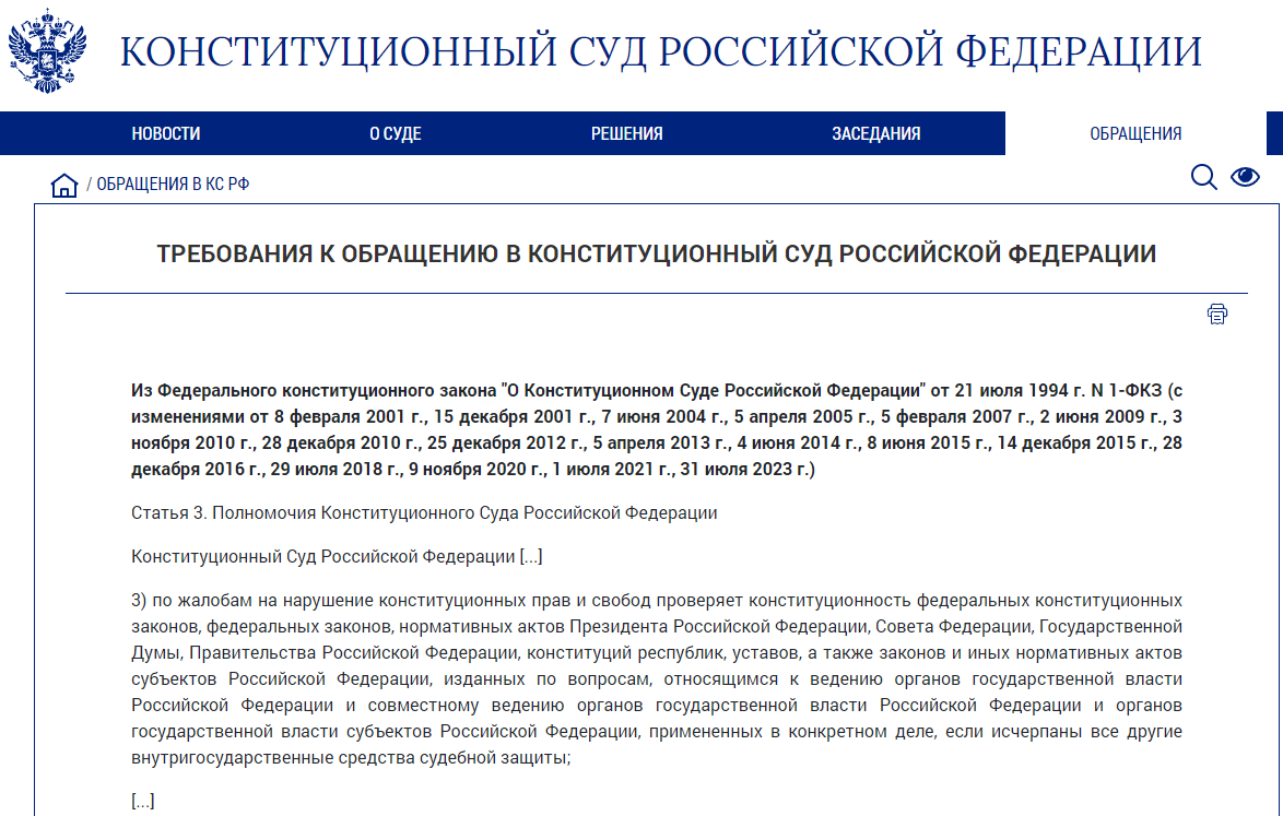 Поэтому, перед тем как подавать жалобу в Конституционный Суд, необходимо удостовериться в том, что она соответствует всем требованиям, предъявляемым Конституцией Российской Федерации и ФКЗ о Конституционном Суде к обращению в Конституционный Суд.