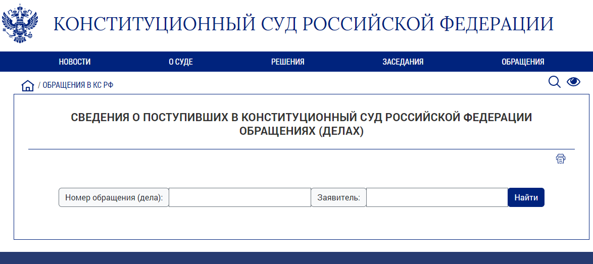 Информацию о поступивших обращениях Вы можете найти на интернет-сайте Конституционного Суда: