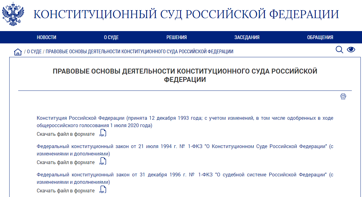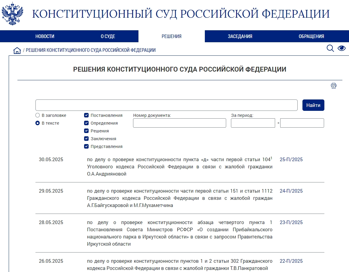 Тексты решений Конституционного Суда публикуются на его интернет-сайте в разделе "Решения КС РФ":