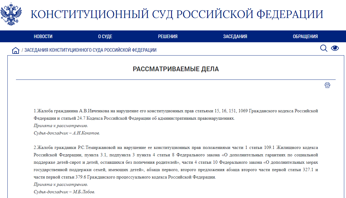 Кроме того, информация о делах, принятых к рассмотрению, находится на интернет-сайте в разделе "Заседания КС РФ", в рубрике "Рассматриваемые дела":